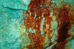 ![]() Petrografische Karte von der Grafschaft Mansfeld; Freiesleben und Schulze 1815; Universitäts- und Landesbibliothek Sachsen-Anhalt ![]() Schmid-Schacht, Helbra Foto Frank Wenzel Röhrigschacht bei Wettelrode Untertage sind farbenprächtige Sinterbildungen an den Stollenwänden zu bestaunen. Sie sind durch Kupferminerale grün und Eisenverbindungen rotbraun gefärbt. Foto Frank Wenzel